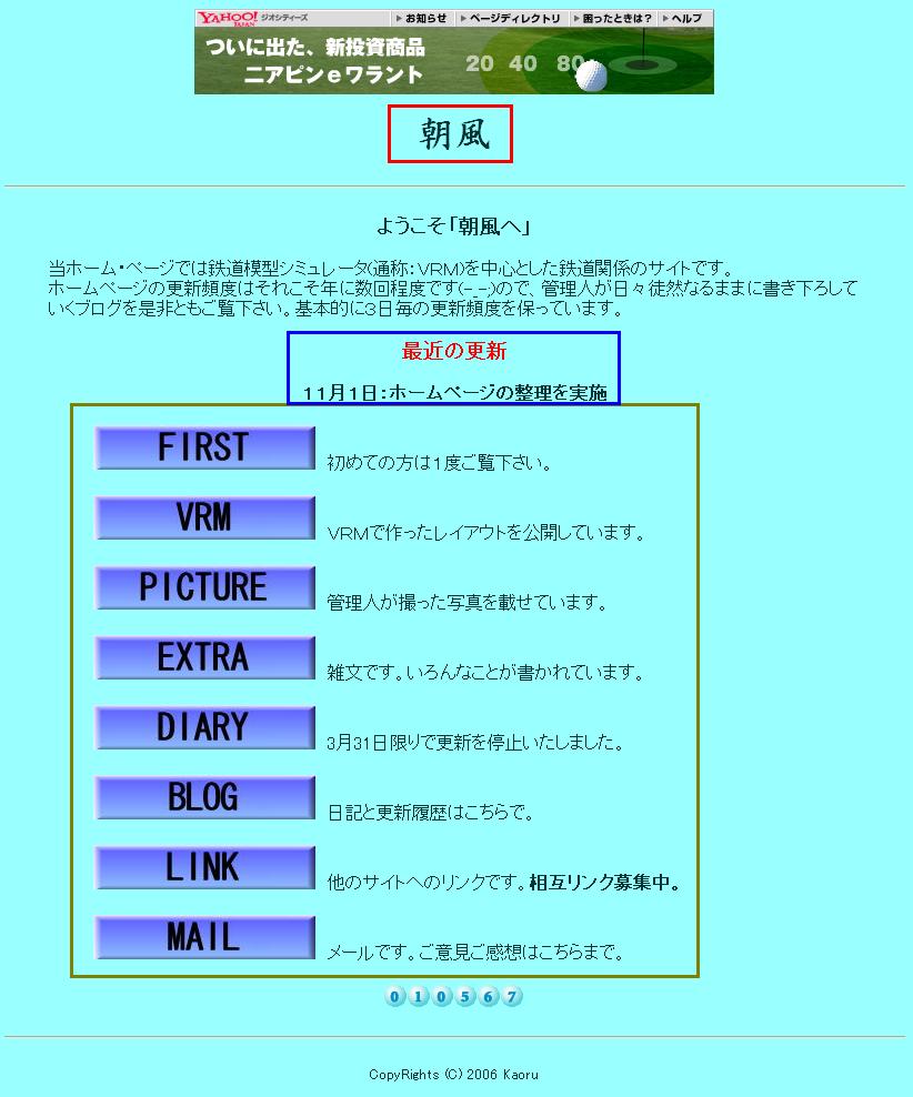 最初のページとしていますが、更新内容、トップ絵らしきものが無く、オマケに「~入り口」へのリンクが貼ってあるため、作りが明らかに表紙向けではないと判断し、やや勝手ながら左画像のページを採点することにしました。