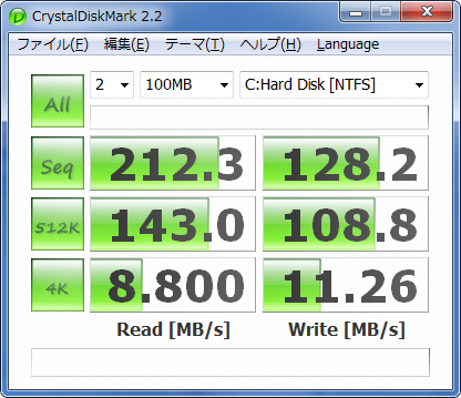 Random Read 4KBの速度はHDDの約20倍といったところです。